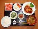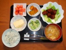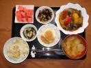 ごはん、味噌汁(白菜、しいたけ、ネギ)、豆腐とり挽肉あんかけ(万能ネギ)、揚げ茄子(万能ネギ)、小松菜と大和芋のおひたし(おかか)、うずら豆煮、フルーツ:大玉スイカ |