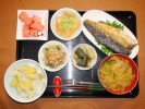さつま芋ごはん、味噌汁(白菜、椎茸、松山あげ)、ノルウェー産のさば塩焼き(大葉)、かぶとあげの煮物(かぶ葉)、水菜おひたし(おかか)、キュウリ中華炒め、フルーツ:大玉スイカ |