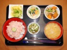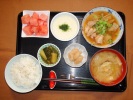 わかめご飯、味噌汁(白菜、椎茸、あげ)、中華ミートボール甘酢あん(サニーレタス、水菜、マヨネーズ)、かぼちゃ煮、ブロッコリーの胡麻ドレ和え、たまご豆腐、フルーツ:スイカ |