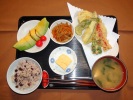 お赤飯(ごま塩)、味噌汁(豆腐、なめこ、三つ葉)、天ぷら盛合せ(天つゆ、さつま芋、かぼちゃ、茄子、ピーマン、パプリカ赤、アスパラ、竹輪いそべ)、金平ごぼう、厚焼きたまご、フルーツ:アムスメロン、サクランボ |