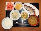 ごはん、味噌汁(茄子、あげ、みょうが)、鰆白醤油焼き、ジャガイモ粉ふき煮(三方原ブランド)、ゴーヤ炒め(豚肉、たまご)、酢の物(もやし・キュウリ・竹輪)、フルーツ:大栄ブランド大玉スイカ |
