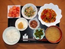 ごはん、味噌汁(大根、しいたけ、なめこ)、揚げシューマイ甘酢あんかけ(ピーマン、パプリカ赤・黄)、小松菜炒め(あげ、おかか)、豆腐なめ茸がけ、うずら豆煮、ししとう炒め煮、フルーツ:大玉スイカ |