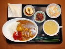 ポークカレー(豚肉、ポークカレー、豚肉、玉ネギ、人参、ジャガイモ、福神漬け)、コンソメオニオンスープ(パセコン)、コールスローサラダ、ゆで玉子のあんかけ(黒ごま)、うづら豆煮、フルーツ:新高梨 |