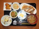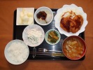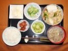 ごはん、味噌汁(白菜、しいたけ、あげ)、ポテトコロッケ(特製ソース、千切りキャベツ)、大根胡麻味噌田楽、スパゲティサラダ(人参、キュウリ、ロースハム)、キュウリ中華炒め、フルーツ:リンゴ(青森トキ) |