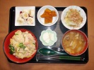 親子丼(とり肉、玉ネギ、なると、玉子、三つ葉)、味噌汁(白菜、しめじ、あげ)、白菜おひたし(おかか)、かぼちゃ煮、大根のぬか漬け、フルーツ:バナナ、ブルーベリーソースがけ |