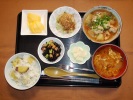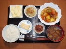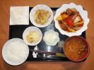 ごはん、味噌汁(大根、なめこ)、ミートボール酢豚風(玉ネギ、人参、ピーマン赤・緑、椎茸、竹の子)、白菜のおひたし(おかか)、さつま芋レモン煮、大根のぬか漬け、フルーツ:稲城梨 |