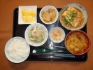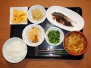 ごはん、味噌汁(おふ、ワカメ、長ネギ)、鰆西京焼き、ポテトサラダ(人参、キュウリ、ロースハム、ゆで玉子)、野菜たまごとじ(キャベツ、人参、玉ネギ、椎茸、たまご)、もずく酢(キュウリ)、フルーツ:柿(禅寺丸)、干し柿 |