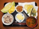 さつ芋ごはん、味噌汁(茄子、あげ、みょうが)、ホッケ塩焼き、うの花(人参、椎茸、あげ、竹輪、さつま揚げ、長ネギ、たまご、枝豆)、オクラおひたし(おかか)、厚焼きたまご、フルーツ:禅寺丸柿 |