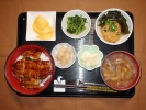 ごはん、味噌汁(茄子、あげ、みょうが)、酢とり(とり肉、玉ネギ、人参、しいたけ、たけのこ、ピーマン、生パイナップル)、白菜のおひたし(おかか)、厚焼きたまご、うずら豆煮、フルーツ:リンゴ |