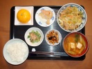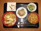 かつ丼(豚ロースかつ、玉ネギ、たまご、グリーンピース)、味噌汁(白菜、あげ、椎茸)、酢の物(キュウリ、ワカメ、カニカマ)、水菜おひたし(おかか)、フルーツ:バナナブルーベリーソースがけ |