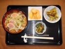 煮込みうどん(細うどん、豚肉、人参、白菜、しめじ、椎茸、あげ、長ネギ、なると)、大学芋(黒いりごま)、キュウリ中華炒め、フルーツ:柿 |