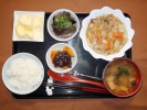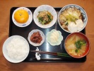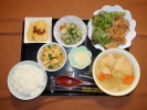 ごはん、ポトフスープ(キャベツ、人参、玉ネギ、ベーコン、ジャガイモ)、豚肉生姜焼き(豚ロース、玉ネギ、サニーレタス)車ふの玉子とじ(三つ葉)、ソフト揚げ・大根おろし・オクラ和え、大根柚子漬け、フルーツ:リンゴコンポート(干しぶどう) |