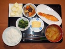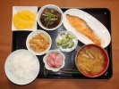 ごはん、味噌汁(白菜、あげ、しめじ)、鮭の塩焼き、田舎煮(大根、人参、こんにゃく、椎茸、あげ、竹輪、さつま揚げ)、ほうれん草なめ茸和え、厚焼きたまご、フルーツ:リンゴ |