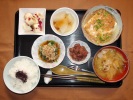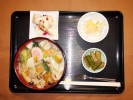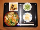 煮込みうどん(おっ切りつるつるうどん、白菜、人参、豚肉、椎茸、ほうれん草、長ネギ、あげ)、たまご焼き(桜えび入り)、ブロッコリーの胡麻ドレ和え、フルーツ:りんごコンポート(レーズン入り) |