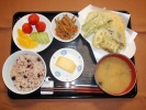お赤飯(ごま塩)、味噌汁(豆腐、なめこ、三つ葉)、天ぷら盛合せ(天つゆ、さつま芋、かぼちゃ、茄子、ピーマン、アスパラ、オクラ、レンコン、竹輪いそべ)、金平ごぼう(白すり胡麻)、厚焼きたまご、フルーツ:イチゴ、キウイフルーツ、伊予柑) |