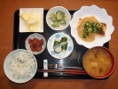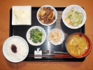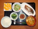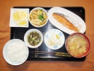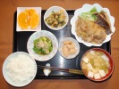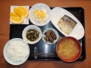 ごはん、味噌汁(豆腐、あげ、しめじ、長ネギ)、いなだ白醤油焼き、ソフト揚げ(大根おろし、なめ茸、刻みオクラ和え)、ほうれん草の胡麻和え、うずら豆煮、フルーツ:ミネラルオレンジ |