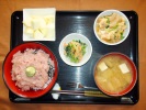 まぐろ丼(寿めし、刻み海苔、キュウリわさび乗せ)、味噌汁(豆腐、あげ、ワカメ、長ネギ)、車ふのたまごとじ(三つ葉)、ほうれん草と人参の胡麻和え、フルーツ;リンゴ |