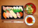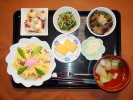 五目ちらし寿司(人参、れんこん、あげ、椎茸、かんぴょう、絹さや、錦糸玉子、桜でんぶ)、松茸風味のすまし汁(ワカメ、おふ、紅白はんぺん、三つ葉)、茄子とピーマンの炒め煮(白すり胡麻)、水菜とびっこ和え、厚焼きたまご、大根柚子漬け、フルーツ:バナナ(ブルーベリーソースがけ) |