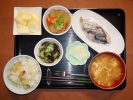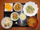 ごはん、味噌汁(大根、あげ、しめじ)、鯖の塩焼き、マカロニポテトサラダ(人参、キュウリ、ロースハム、ゆで玉子)、もずく酢(キュウリ)、茄子のポン酢炒め、フルーツ:カシュ―オレンジ |