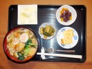 わかめごはん、味噌汁(大根、なめこ、あげ)、豆腐ステーキ和風ソースがけ(大根おろしなめ茸、刻みオクラ)、ブロッコリーの胡麻ドレ和え、うずら豆煮、鈴廣かまぼこ(しそかをり巻き)、フルーツ:リンゴ |