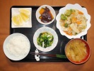 ごはん、味噌汁(白菜、あげ)、揚げシューマイの甘酢あんかけ(ピーマン、パプリカ赤・黄)、大根とがんもの含め煮(大根葉)、ひじき煮(人参、あげ、大豆、むき枝豆)、大根のべったら漬け、フルーツ:リンゴ |