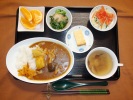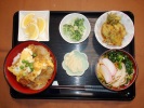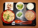 かつ丼(豚ロースカツ、玉ネギ、玉子、グリーンピース)、そうめん汁(小松菜、紅かまぼこ、万能ネギ)、ブロッコリー胡麻ドレ和え、ふきのとう天ぷら(あんかけ汁)、大根柚子漬け、フルーツ:はるか |