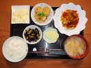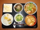 ごはん、味噌汁(豆腐、あげ、しめじ、長ネギ)、麻婆茄子(豚ひき肉、茄子、ピーマン)、大根柚子味噌田楽、揚げ出し豆腐(うたなかま産の青菜)、厚焼きたまご、フルーツ:山形リンゴ |