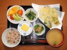 お赤飯(ごま塩)、味噌汁(豆腐、なめこ、三つ葉)、天ぷら盛合せ(天つゆ、さつま芋、かぼちゃ、れんこん、ピーマン、オクラ、いんげん、茄子、竹輪いそべ)、金平ごぼう、フルーツ:イチゴ、キウイフルーツ、マンダリンオレンジ |