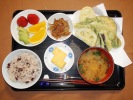 お赤飯(ごま塩)、味噌汁(豆腐、なめこ、三つ葉)、天ぷら盛合せ(天つゆ、さつま芋、かぼちゃ、れんこん、茄子、アスパラ、ピーマン、竹輪いそべ)、ほうれん草の胡麻和え、ブロッコリーのおひたし(おかか)、厚焼き玉子、フルーツ:メロン、イチゴ、キウイフルーツ |