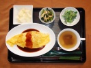 チキンオムライス(特製デミグラスソースがけ)、いろいろキノコのコンソメスープ、ブロッコリーの胡麻ドレ和え、小松菜とあげの炒め、フルーツ:リンゴ |