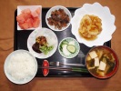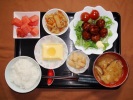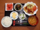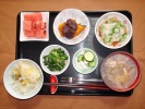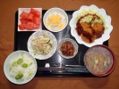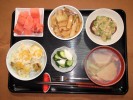 ごはん、味噌汁(キャベツ、椎茸、あげ)、ミートボール中華甘酢あんかけ(水菜、ミニトマト、マヨネーズ)、切干大根煮(人参、あげ、竹輪、さつま揚げ)、玉子豆腐、白花のいんげん豆煮、フルーツ:スイカ |