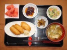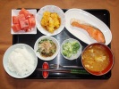ごはん、味噌汁(たまねぎ、たまご)、チリ産の塩鮭焼き、とうもろこしの天ぷらあんかけ、ブロッコリーの胡麻ドレ和え、水菜のおひたし(おかか)、フルーツ:大玉スイカ |