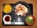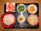 まぐろ丼(寿めし、刻み海苔、キュウリわさび乗せ)、味噌汁(キャベツ、椎茸、あげ)、さつま揚げの甘辛煮、ほうれん草のなめ茸和え、煮たまご、フルーツ:大玉スイカ |