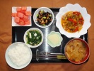 ごはん、味噌汁(白菜、しめじ、あげ)、揚げシューマイの甘酢あんかけ(ピーマン、パプリカ赤・黄)、大豆とひじき煮(あげ、人参、むき枝豆)、ほうれん草の和え物(大和芋、なめ茸)、大根のべったら漬け、フルーツ:大玉スイカ |