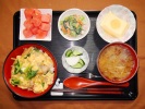 親子丼(とりもも肉、玉ネギ、なると、たまご、三つ葉)、味噌汁(茄子、あげ、みょうが)、小松菜の胡麻和え(人参、紅かまぼこ)、かぶとキュウリの梅しそ漬け、玉子豆腐、フルーツ:大玉スカイ |