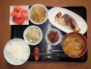 ごはん、味噌汁(白菜、椎茸、あげ)、いなだの白醤油焼き、大根とシーチキン煮(大根葉)、酢の物(もやし、キュウリ、竹輪、白胡麻)、うずら煮、フルーツ:大玉スイカ |