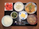 ごはん、味噌汁(大根、あげ、しめじ、かぶ葉)、ロースとんかつ(千切りキャベツ、トマト、特製ソース)、ひじき煮(人参、あげ、大豆、むき枝豆)、厚焼きたまご、かぶとキュウリの梅しそ漬け、フルーツ:大玉スイカ |