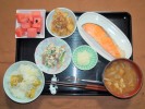 さつま芋ごはん、味噌汁(白菜、あげ)、チリ産の鮭の塩焼き、ほうれん草の白あえ(人参、こんにゃく、豆腐)、はちくとあげの煮物(おかか)、大根おろし甘酢生姜和え、フルーツ:大玉スイカ |