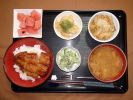 かつ丼(豚ロースかつ、玉ねぎ、たまご、グリーンピース)、味噌汁(大根、大根葉、あげ)、ほうれん草・小松菜・大和芋・なめ茸の和え物、白花いんげん豆、大根切り漬け、フルーツ:大玉スイカ |