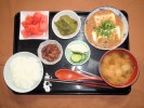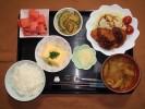 ごはん、味噌汁(白菜、椎茸、あげ)、チキンカツ(千切りキャベツ、ミニトマト、特性ソース)、ゴーヤ炒め(豚肉、たまご)、たまご豆腐(三つ葉)、大根のゆず漬け、フルーツ:大玉スイカ |