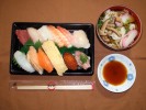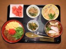まぐろ丼(寿めし、刻み海苔、キュウリわさび乗せ)、味噌汁(かぶ、かぶの葉、しめじ)、がんも含め煮(がんもどき、大根、人参)、煮たまご(黒ごま)、かぶとキュウリの梅しそ漬け、フルーツ:大玉スイカ |
