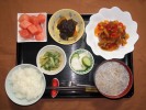 ごはん、味噌汁(玉ねぎ、た、たまご)、鰆の白醤油焼き、新ジャガイモの粉ふき煮、酢の物(もやし、キュウリ、竹輪、白すり胡麻)、トマトワサビ醤油和え(刻み海苔)、フルーツ:大玉スイカ |