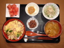 親子丼(とりもも肉、玉ねぎ、なると、たまご、三つ葉)、味噌汁(白菜、しめじ、あげ)、酢の物(もやし・キュウリ・竹輪・白すり胡麻)、豆腐なめ茸がけ、うずら豆煮、フルーツ:大玉スイカ |