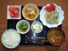 ごはん、味噌汁(大根、椎茸、あげ)、とり唐揚げ中華風(レタス、ししとう、マヨネーズ)、小松菜のごま和え(人参、紅かまぼこ)、さつま揚煮、キュウリの梅しそ漬け、フルーツ:大玉スイカ |