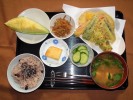 お赤飯(ごま塩)、味噌汁(豆腐、なめこ、三つ葉)、てんぷら盛り合わせ(天つゆ、さつま芋、かぼちゃ、茄子、ピーマン、パプリカ赤・黄、竹輪いそべ)、金平ごぼう(白すり胡麻)、厚焼きたまご、うたなかま農園キュウリの梅しそ漬け、フルーツ:メロン |