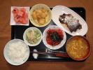 ごはん、味噌汁(茄子、あげ、みょうが)、豆腐ハンバーグ和風ソースがけ(大根おろし、刻みオクラ、なめ茸)、野菜のたまごとじ(キャベツ、人参、玉ねぎ、椎茸)、山東菜のからし和え、長芋の梅しそ漬け、フルーツ:大玉スイカ |