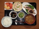 ごはん、味噌汁(キャベツ、しめじ、あげ)、鯖の塩焼き、新じゃがの粉ふき芋、ほうれん草・なめ茸・大和芋の和え物、大根おろしと甘酢生姜和え、フルーツ:大玉スイカ |