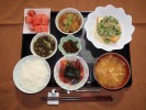 ごはん、味噌汁(たまねぎ、たまご)、厚揚げ和風ソースがけ(大根おろし、刻みオクラ、なめ茸)、豚肉と大根の炒め煮(大根葉)、もずく煮(キュウリ)、トマトのわさび醤油和え(刻み海苔)、キュウリ大根の漬物(野田キッコーマン)、フルーツ:大玉スイカ |