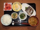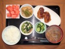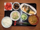 ごはん、味噌汁(白菜、しめじ、あげ)、鯖の塩焼き(厚焼きたまご、ししとう)、酢の物(もやし、キュウリ、竹輪、白のすり胡麻)、ひじき煮(大豆、あげ、人参)、キュウリの梅しそ漬け、フルーツ:大玉スイカ |