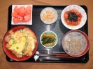 親子丼(とりもも肉、玉ネギ、なると、玉子、刻み海苔)、味噌汁(大根、あげ、しめじ)、ゴーヤ炒め(豚肉、たまご)、もずく酢(キュウリ)、ししとう煮(ミニトマト)、きざみみ沢庵、フルーツ:大玉スイカ |